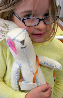 With this project, everyone in the studio learned how to cut out a simple pattern, do machine zig-zagging and basic assembly with this wonderful bunny. Most kids had done hand stitching and embroidery with me before, and this time a good portion of the kids learned the blanket stitch which took patience and skill. EVERYONE loved their bunnies! Can't you see it on their faces?